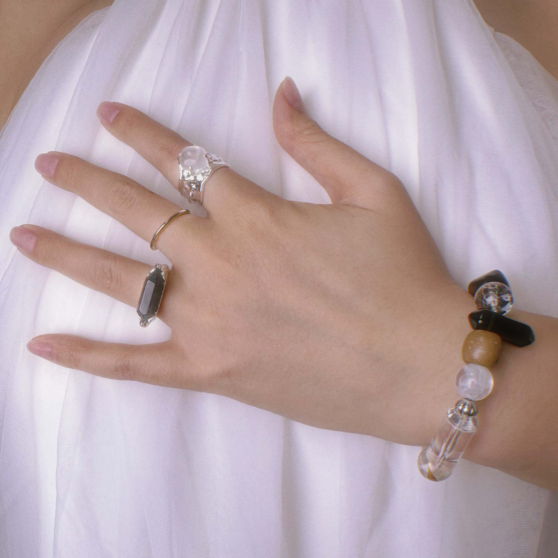 Chuncky White Crystal Bracelet with Obsidian and Wooden Beads