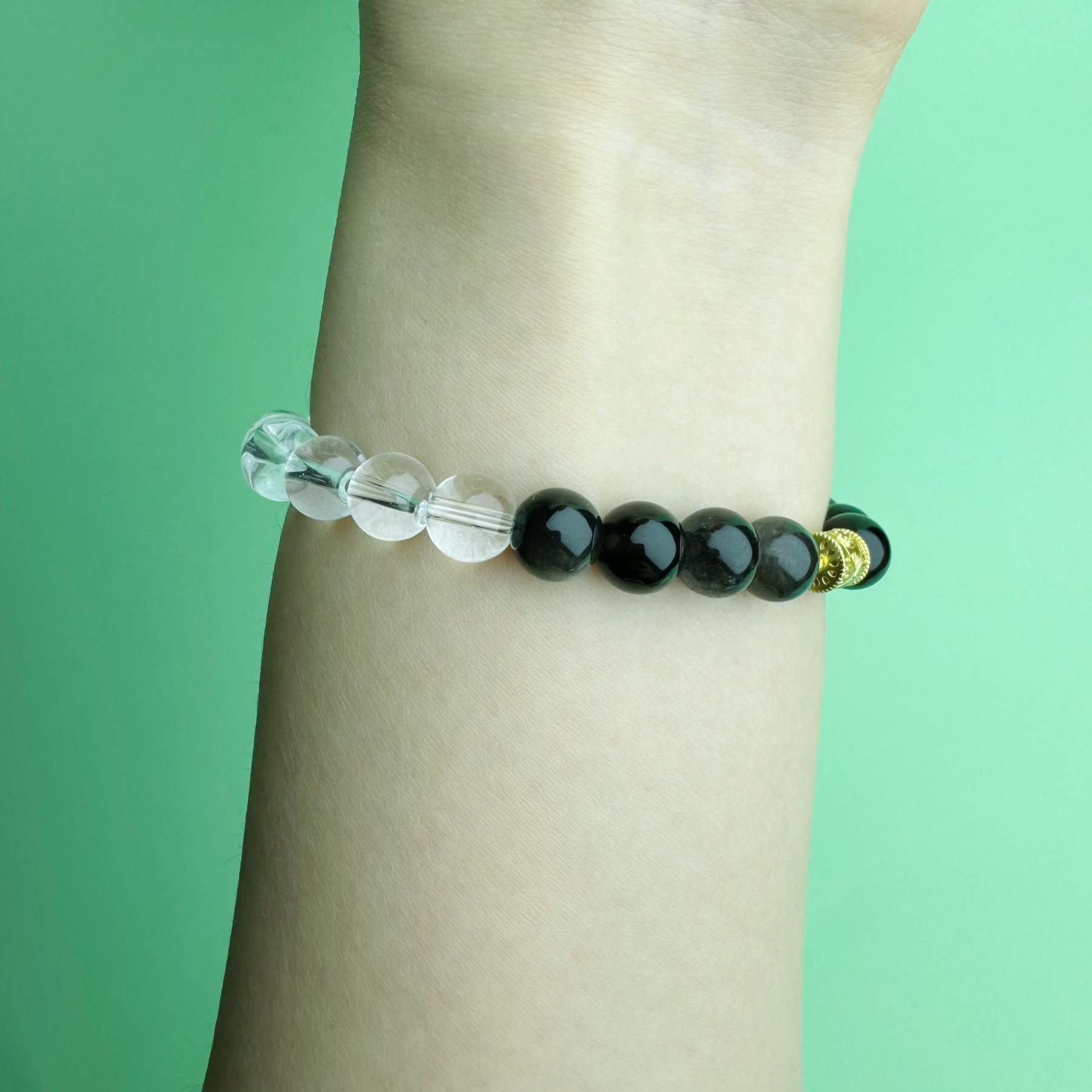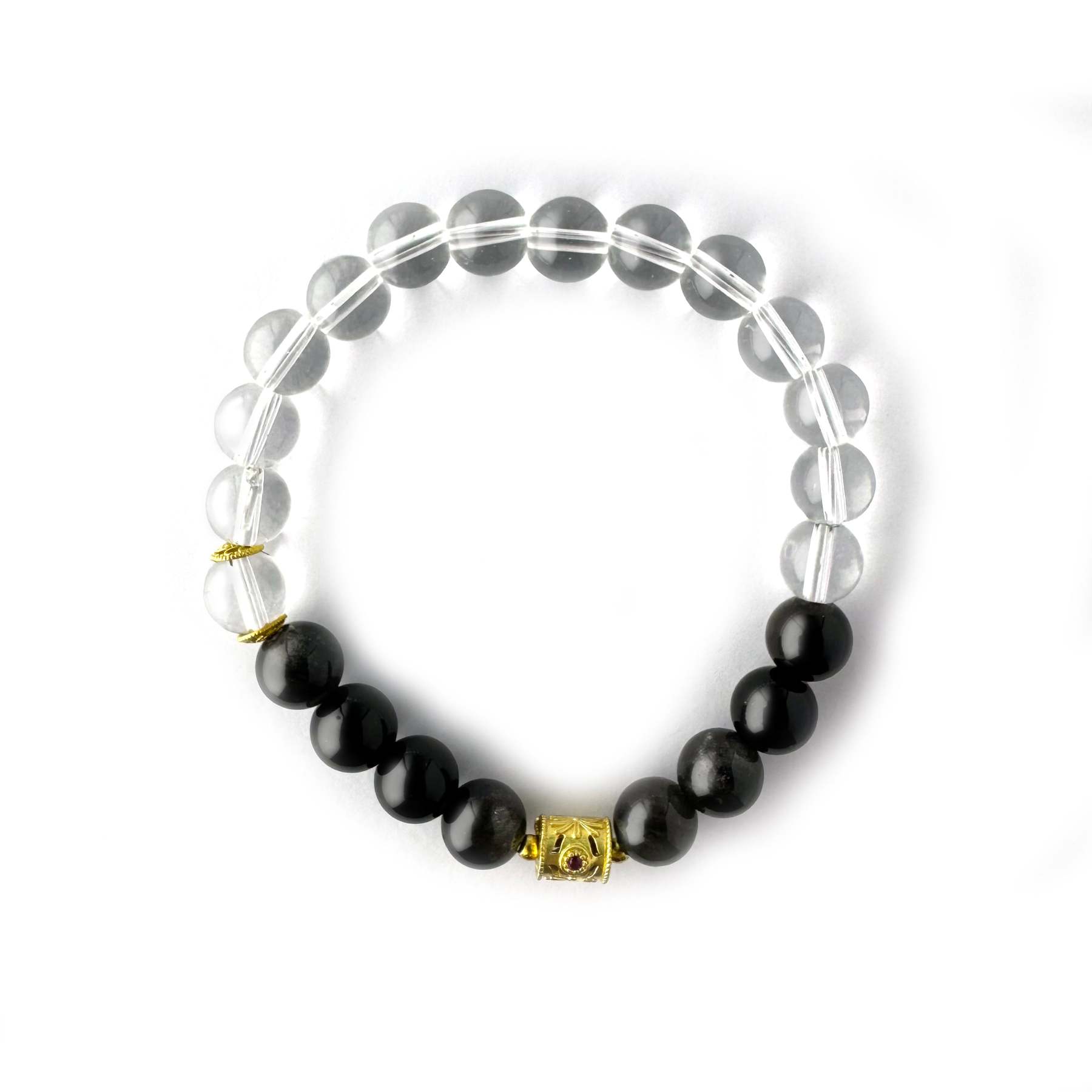 White Crystal Bracelet With Black Obsidian And Gold Beads